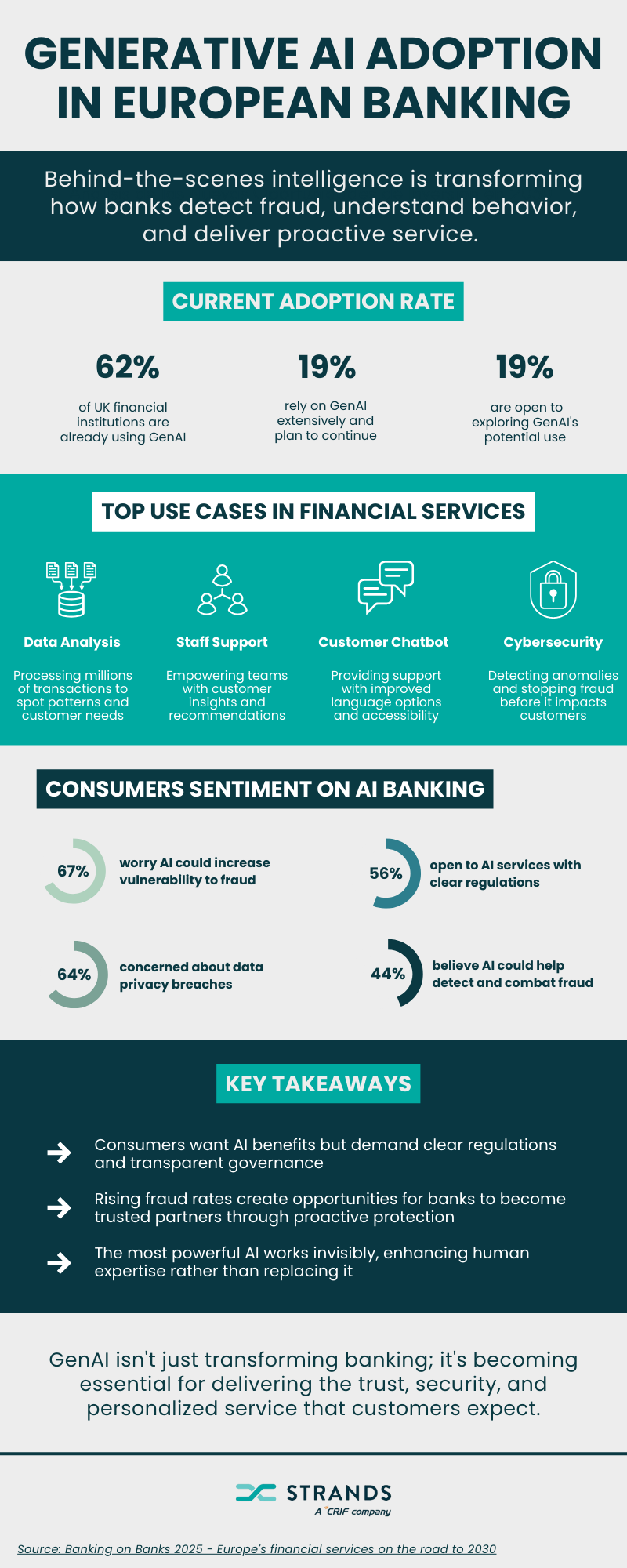 Successful GenAI implementation for banking requires focus on high-value use cases, a commitment to transparency and governance, and recognition that AI’s role is to enhance human judgment, not replace it.